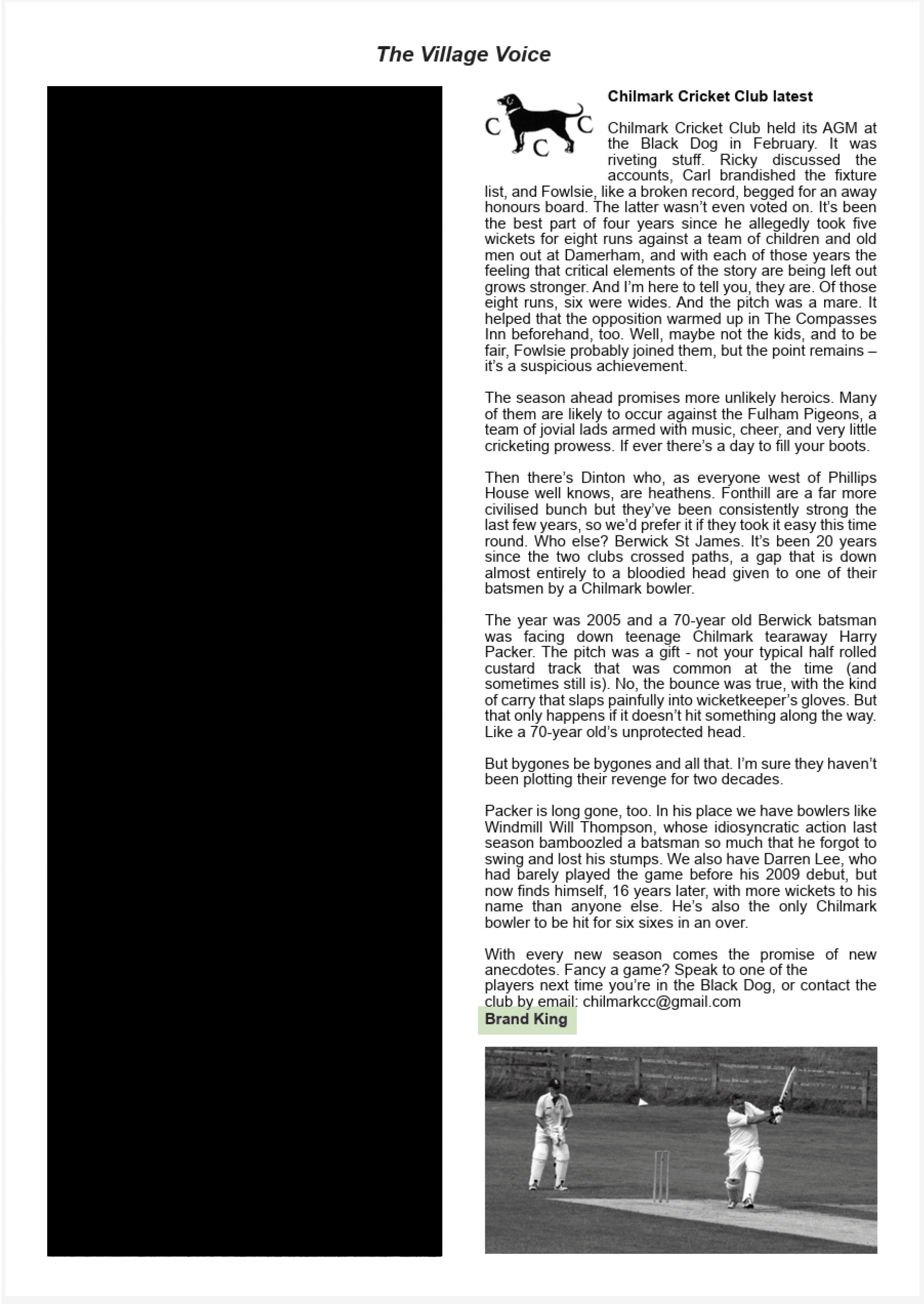 I've been a regular contributor to "The Village Voice," a monthly newsletter for locals and newcomers, for five years. My updates and assessments of Chilmark Cricket Club (CCC) provide light-hearted but community-building intel to enthusiasts and supporters throughout Chilmark, Fonthill Bishop, Ridge, and Berwick St. Leonard.